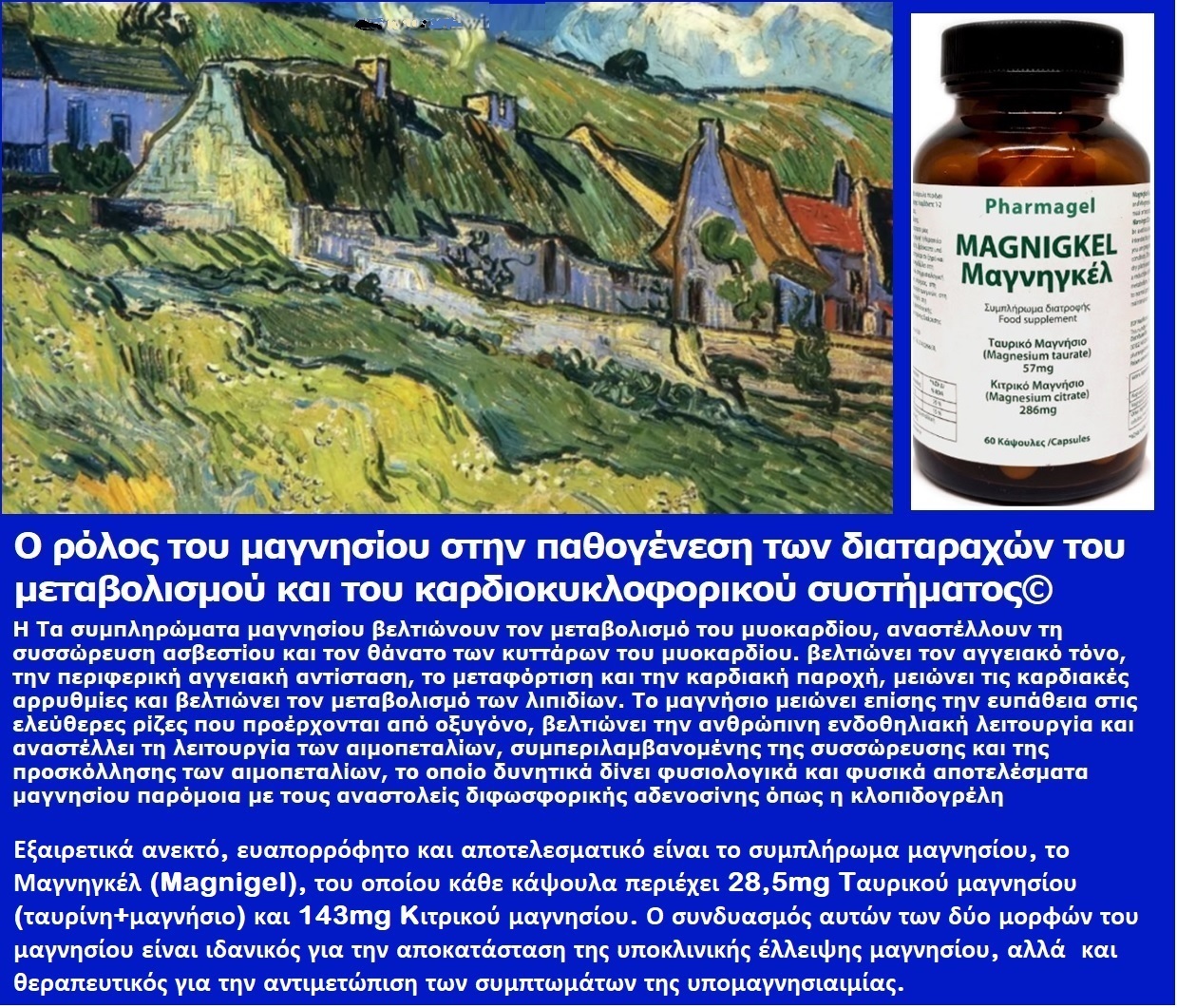 Εξαιρετικά ανεκτό, ευαπορρόφητο και αποτελεσματικό είναι το συμπλήρωμα μαγνησίου, το Μαγνηγκέλ (Magnigel), του οποίου κάθε κάψουλα περιέχει 28,5mg Tαυρικού μαγνησίου (ταυρίνη+μαγνήσιο) και 143mg Kιτρικού μαγνησίου. Ο συνδυασμός αυτών των δύο μορφών του μαγνησίου είναι ιδανικός για την αποκατάσταση της υποκλινικής έλλειψης μαγνησίου, αλλά και θεραπευτικός για την αντιμετώπιση των συμπτωμάτων της υπομαγνησιαιμίας.